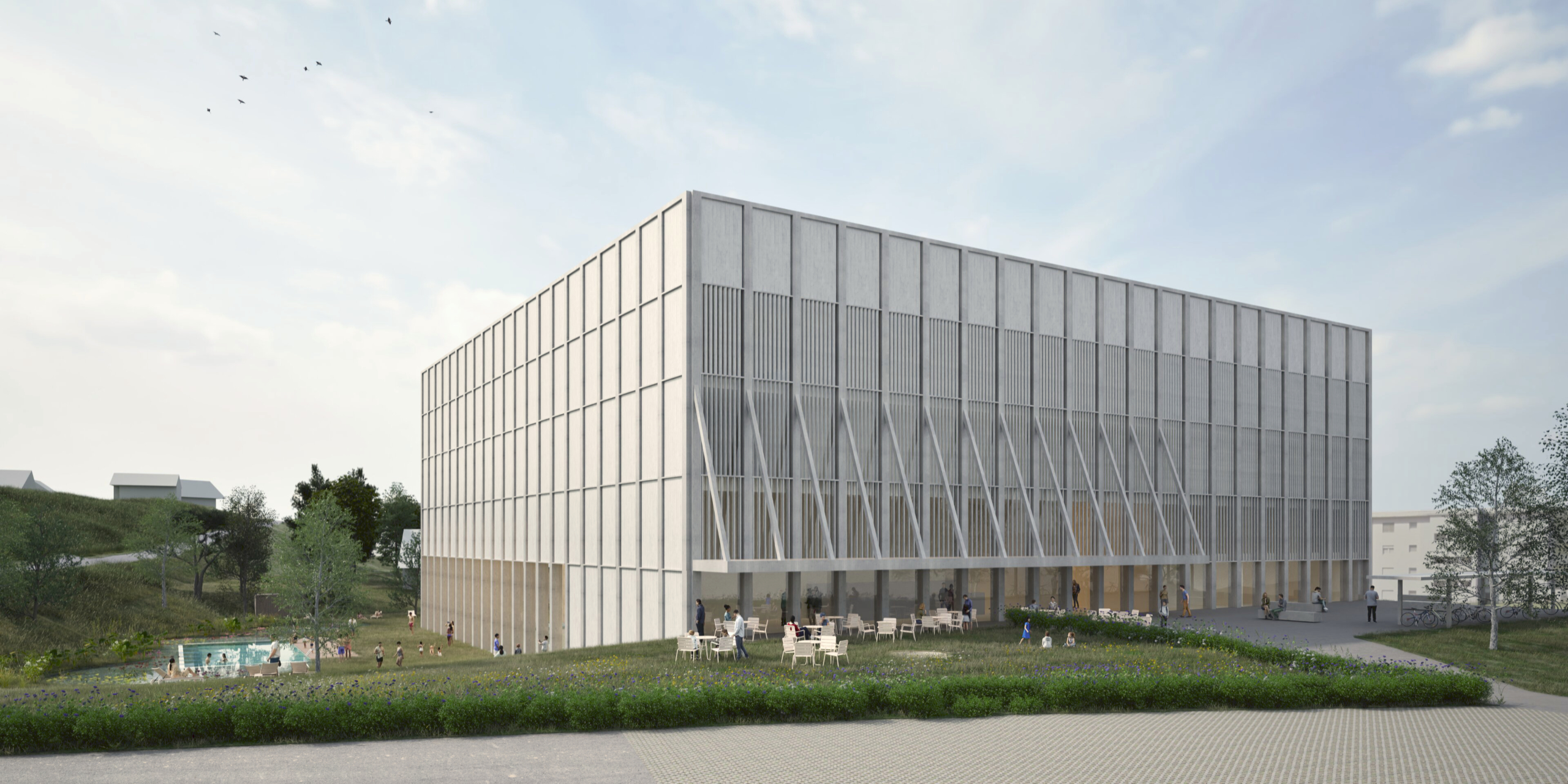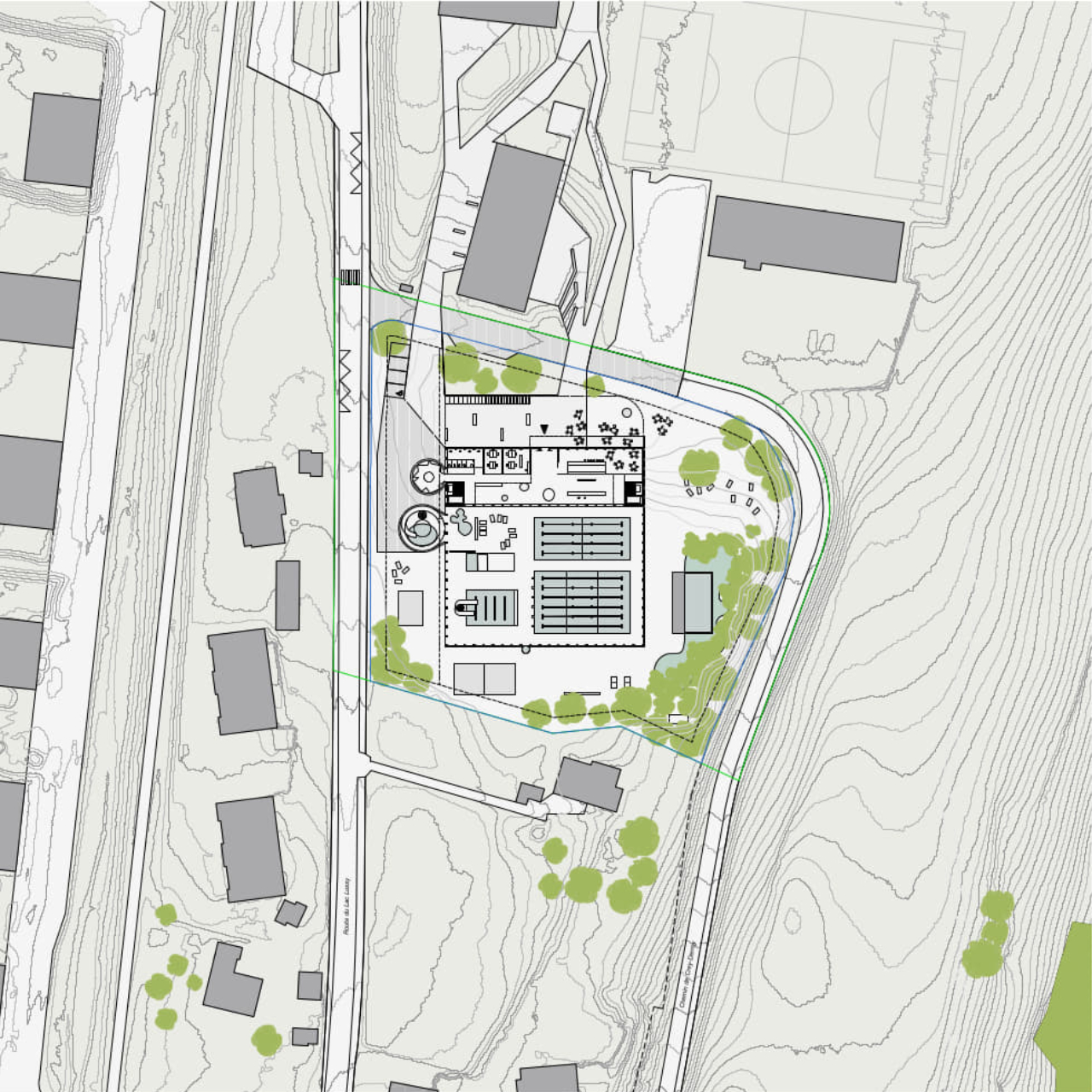 Maître de l’ouvrage : Association des communes pour le cycle d’orientation de la Veveyse Lieu : Châtel-Saint-Denis Projet : 2025 SPBU : 11’889 m2 Volume : 74’135 m3